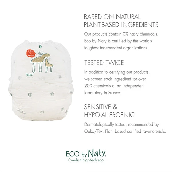 Pull-on and go with the Biobased Pull On Pants Sze 5 by Eco by Naty! Perfect for travel or just the day-to-day, these super-soft pull-on pants provide optimal comfort, breathability, and superb leakage protection. Eco by Naty employs eco-friendly materials from renewable resources that are both bio-based and plant-based. The pull-on features a highly absorbent core made from 100% FSC certified wood pulp, elastic tear-away sides, and leg cuffs. Each layer is comprised of breathable, naturally biodegradable materials that minimize the risk of irritation and diaper rash so you can feel confident that your little one is both comfortable and safe. Plus, Eco by Naty is dedicated to steering clear of any potential irritants, including VOCs, parabens, latex, or fragrance, and has been independently reviewed and accredited by several certification bodies. This eco-friendly diaper is ideal for babies that weigh between 26 and 40 pounds.