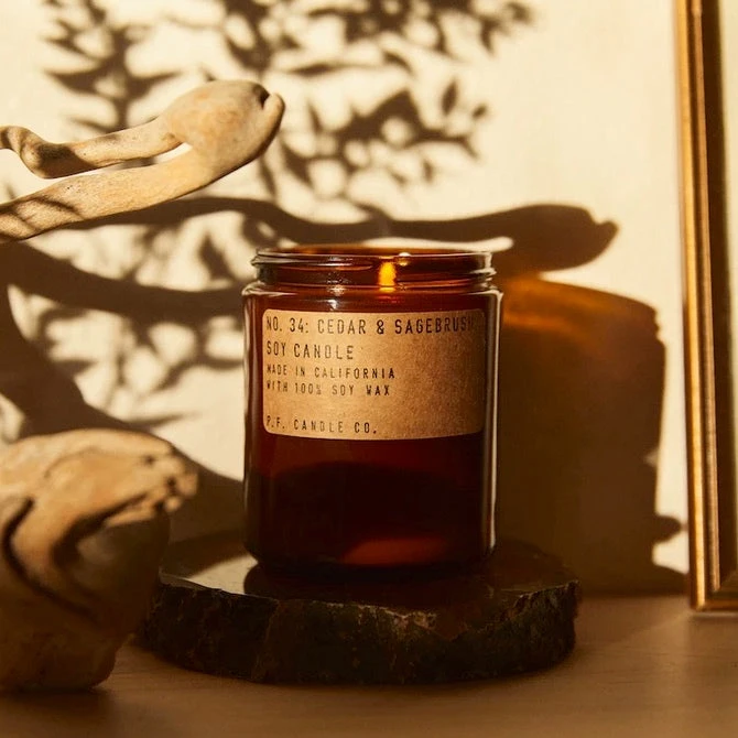 Bring light into your home with the Cedar + Sagebrush Soy Candle 7.2oz from P.F. Candle Company! Made from 100% vegan and non-toxic soy wax with scents of cedar and sagebrush, these candles are hand-poured into apothecary inspired glass amber jars with a Kraft paper label and brass lid. Great for dressers, countertops, nightstands, and desks alike, this gift-able soy candle is paraben free, plastic free, and never tested on animals. Get one for yourself, and a friend!