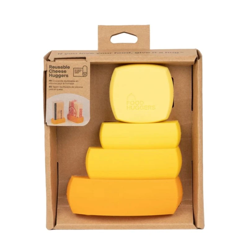 Cheese Huggers tightly seal the opened ends of cheese, keeping them from drying out. With four different sizes that stretch to fit, they secure the cut ends of leftover cheese. Made of 100% food grade and food safe silicone, reusable Cheese Huggers are the perfect alternative to plastic wrap, foil, and baggies!