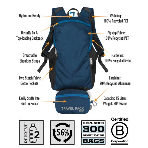 The ChicoBag Travel Pack is the perfect backpack to take with you on any adventure. Made from lightweight recycled materials, this bag is both earth-friendly and versatile! It conveniently stuffs into a built-in pocket for travel. You can adjust the shoulder and sternum straps, or pack your favorite water bottle into the stretchy side pockets. Whether youโre heading to a festival, going to a baseball game, or traveling the world, this bag has your back!