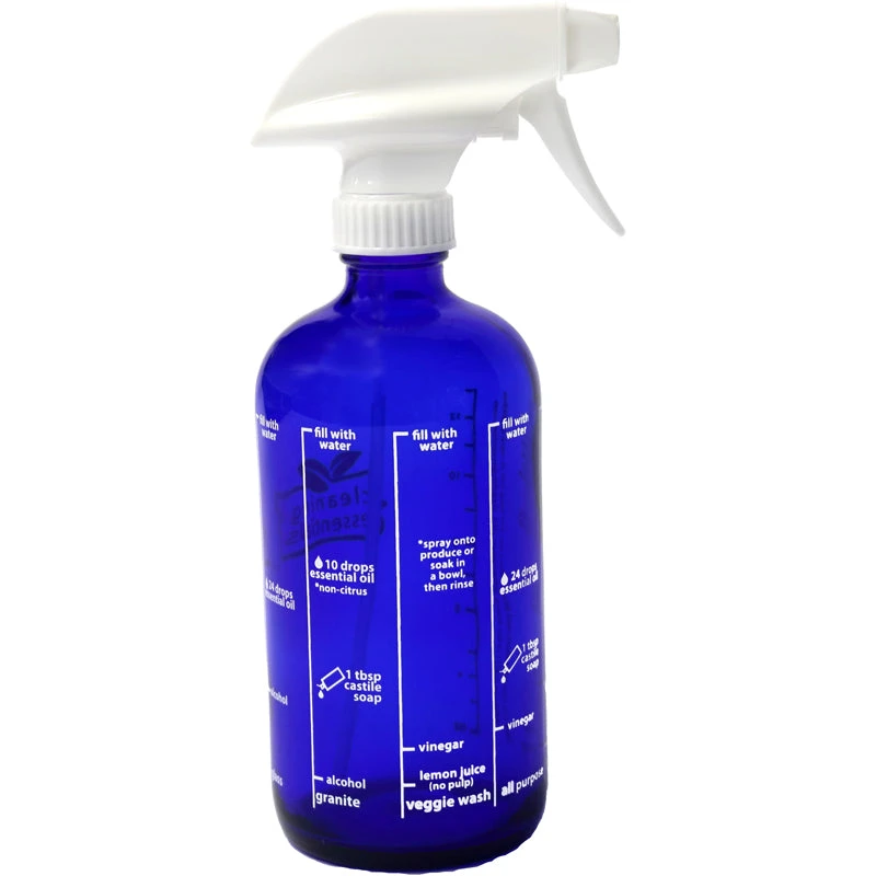 Clean the natural way with the Blue Glass Spray Bottle from Cleaning Essentials! Made from 100% BPA-free and lead-free glass that is colored to protect EOs from UV damage, this refillable spray bottle is perfect for making your own DIY cleaning recipes. It features several recipes on the outside for you to try, and has 2 trigger sprayer settings. Plus, it’s made in the USA from durable glass!