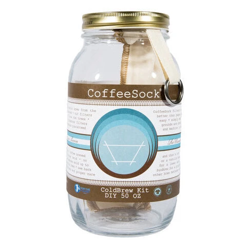Get your cold brew fix without the coffee shop with the Cold Brew Kit from CoffeeSock! With a ColdBrew Filter and a conveniently included canning jar, this set gives you everything you need to get your brew started โ just add grounds and water. These durable organic cotton filters last for about a year and provide a robust, crisp, and flavorful profile without the paper filter taste or the french press acidity. Every CoffeeSock filter is handmade in the USA from GOTS Certified Organic Cotton by a fun-loving crew of coffee fanatics.