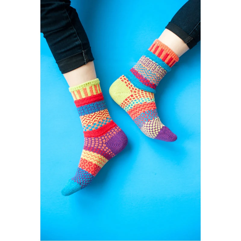 Tiptoe through the stars with Solmate’s Cosmos Crew Cut Socks! Featuring a bold pattern from purple, lime, red, orange, and turquoise, these upcycled socks are the perfect mix of functional & fun. Plus, they’re made in the USA from recycled cotton, recycled polyester, nylon, and lycra… so you know youโre being truly sustainable all the way down to your toes.