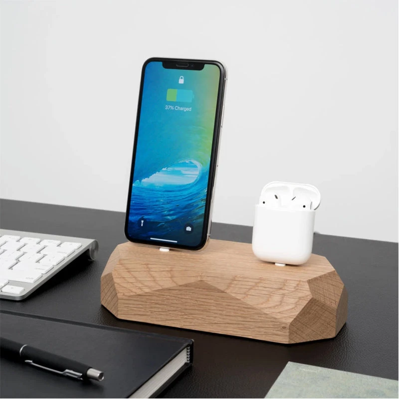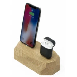 Keep your desk organized, and your space beautiful, with the Dual Wooden iPhone Charging Dock from Oakywood! Handcrafted from FSC Certified solid oak or walnut wood, this iPhone and AirPods charging dock keeps your tech securely in place and easy to locate โ all while charging it so you’re ready to grab it and go. There is a magnet hold and micro-suction technology for your devices to make it easy to put tech on and off the dock with just one hand. Handpolished to have a natural wood shine, with a classic geometric look, it also comes with 2 lightning cables. Charge a phone and AirPods, or two phone at the same time! Plus, for every order, Oakywood will plant 1 tree!