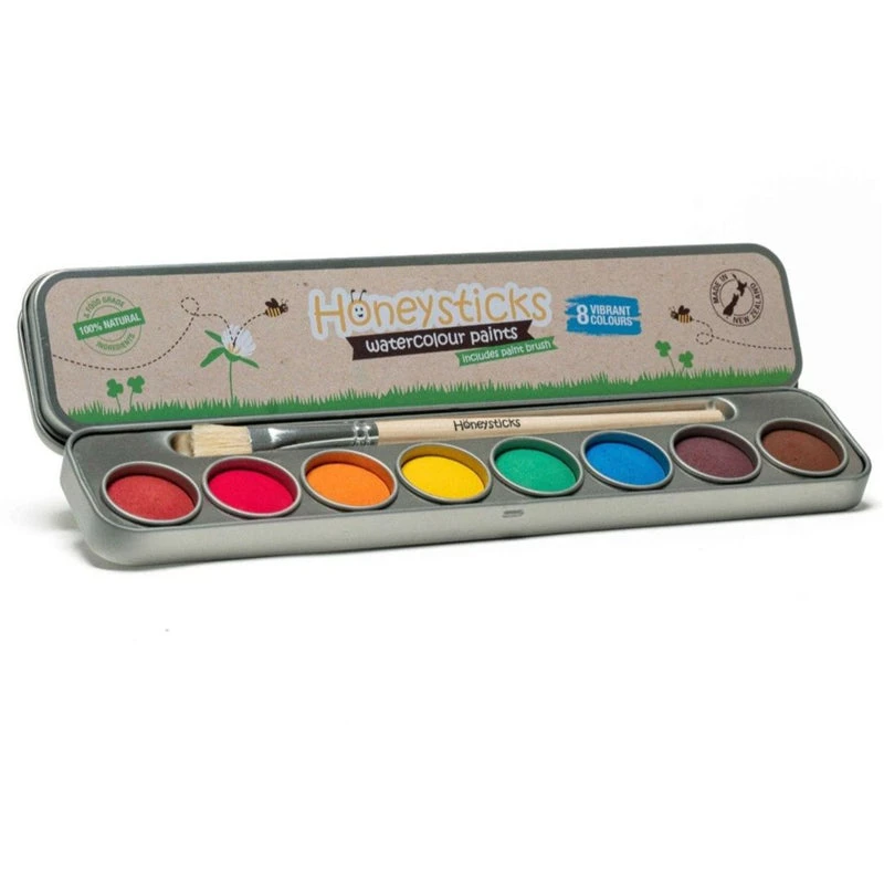 Get creative with the Natural Watercolor Paints from Honeysticks! Handmade in New Zealand from natural and food-grade ingredients, these watercolors have 8 vibrant colors. These paints comes in a metal tin with a natural wood paintbrush, and can be used with coloring books, plain paper, and so much more!