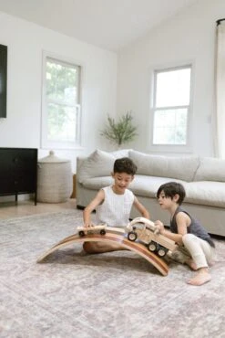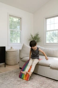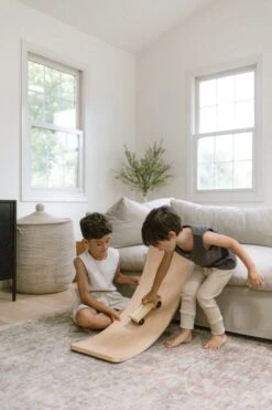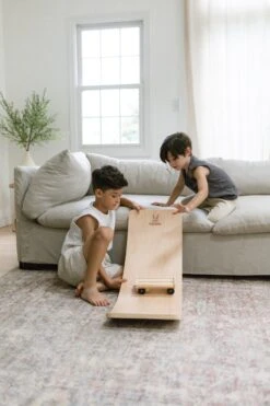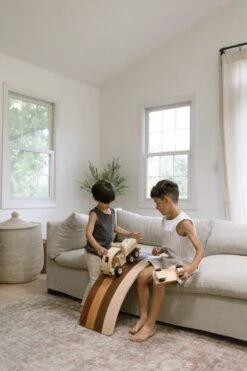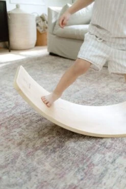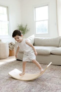 Spark imagination and creative freedom with the Rainbow Wobble Board from Bunny Hopkins! This kids toy can be used as a balance board, which increases core strength and improves reflexes but also features a neutral design to let your little one get creative. From a bridge for toy cars to a secret tunnel, a cradle for a doll โ and so much more โ your little one can make the board into anything they imagine. The wobble board is handcrafted in the USA from sustainably harvested USA-grown birch wood and is non-toxic and heavy metal-free. When used as a balance board, it stimulates the vestibule system, which aids in general development and learning! The wobble board is not for children under the ages of 18 months โ and comes in two sizes, starter for toddlers, and regular for children over the age of 3. Parent supervision is required.