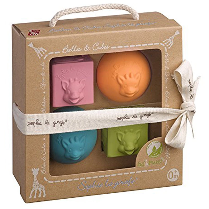 Help to develop baby’s dexterity during playtime with these Natural Rubber Baby Blocks from Sophie la Girafe. Made from non-toxic, BPA-free natural rubber that is lightweight and easy for baby to play with, this baby block set comes with 2 cubes and 2 balls in bright colors to stimulate sight. The raised Sophie the Giraffe faces are a unique texture for baby to teethe on and stimulate sensory learning while they pick up, throw, and play with these natural rubber toys.