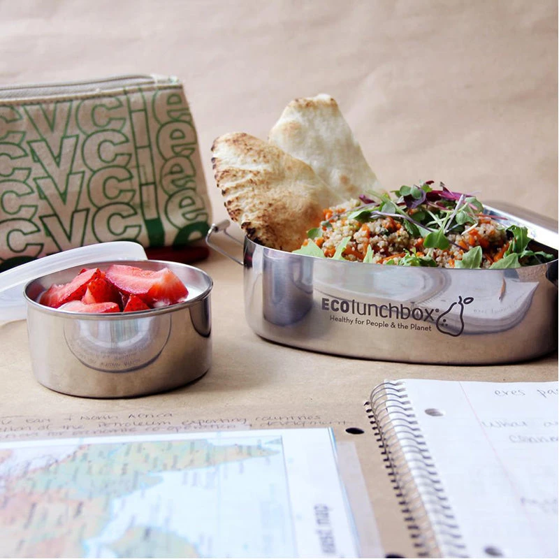 This 2-piece lunch set from ECOlunchbox is the perfect plastic-free snacking accessory. With a large oval container fitting 3 cups of food, and a smaller cup with leak-proof silicone lid fitting 1 cup of food, it’s a great pair for chips and dip, pretzels and hummus, carrots and dressing, or any other mix and match combo you can think of. Each stainless steel container is reusable, toxin-free, and made with food-grade materials.