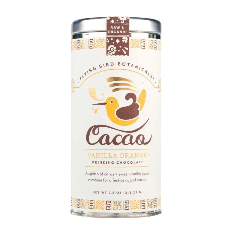 With Flying Bird Botanical’s Vanilla Orange Cacao Hot chocolate, a splash of citrus and sweet vanilla bean combine for a festive cup of cacao. Made with single sourced heirloom Ecuadorian cacao and sun dried cane crystals.