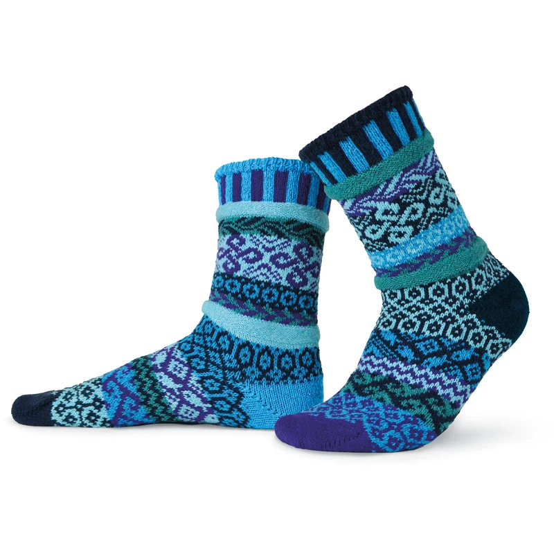 Cool colors for your feet for when the temperature outside cools down! These Solmate socks were inspired by the element, water. The colors in the socks include: turquoise, purple, jade, navy blue, and blue-green. Made in the U.S.A. from recycled cotton, recycled polyester, nylon, and lycra so you know youโre being sustainable all the way to your toes.